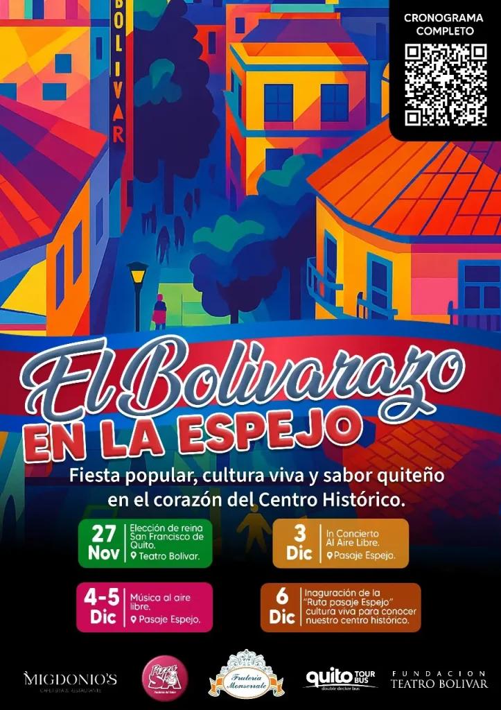 Del 27 de noviembre al 6 de diciembre, el Pasaje Espejo se transformará en un corredor cultural, turístico y gastronómico con el evento “El Bolivarazo en la Espejo”, una iniciativa que busca revitalizar el Centro Histórico y consolidar una calle viva, activa y pensada para el ciudadano.